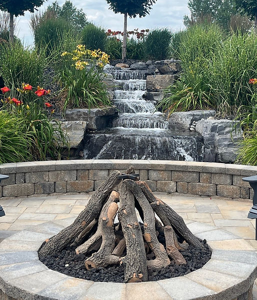 Large scale hardscape project with pavers, segmental block - stadium seating, Gas fire pit & Fire place & Core drilled water feature